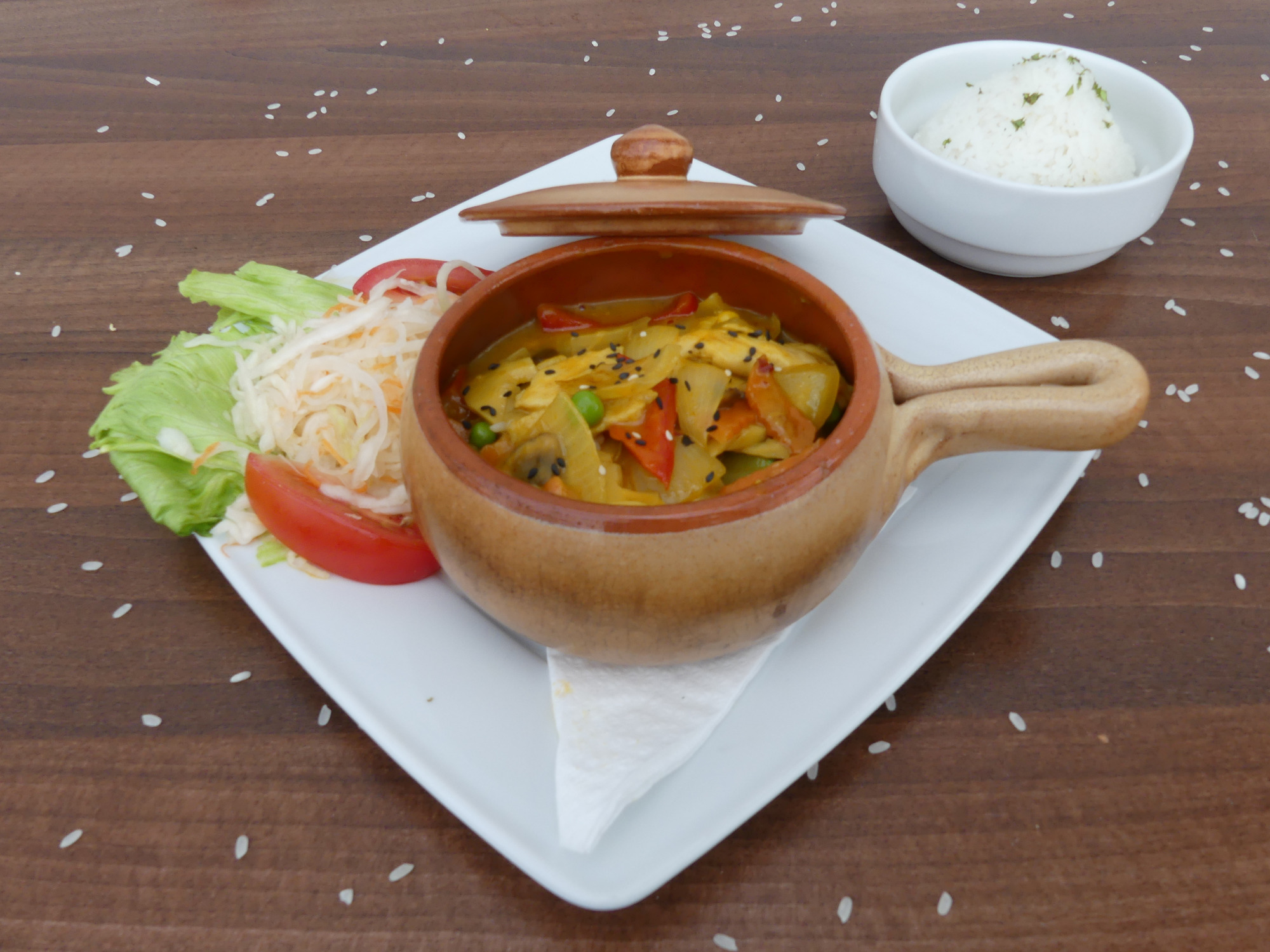 2. Chrumkavé kura so zeleninou, karí omáčka a jazmínová ryža